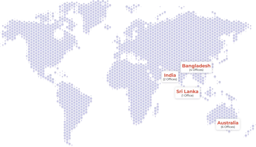 Our Journey started with a single office in 2006 in Melbourne, Australia and since then we have expanded to different geographies Sydney, Adelaide and Perth in Australia, Dhaka and Chattogram offices in Bangladesh and Ahmedabad & Kolkata offices in India and Colombo office in Sri Lanka. Our multifield growth across the segments is a testimony to our commitment to professionalism, persistent hard work, as well as efficient and effective teamwork.